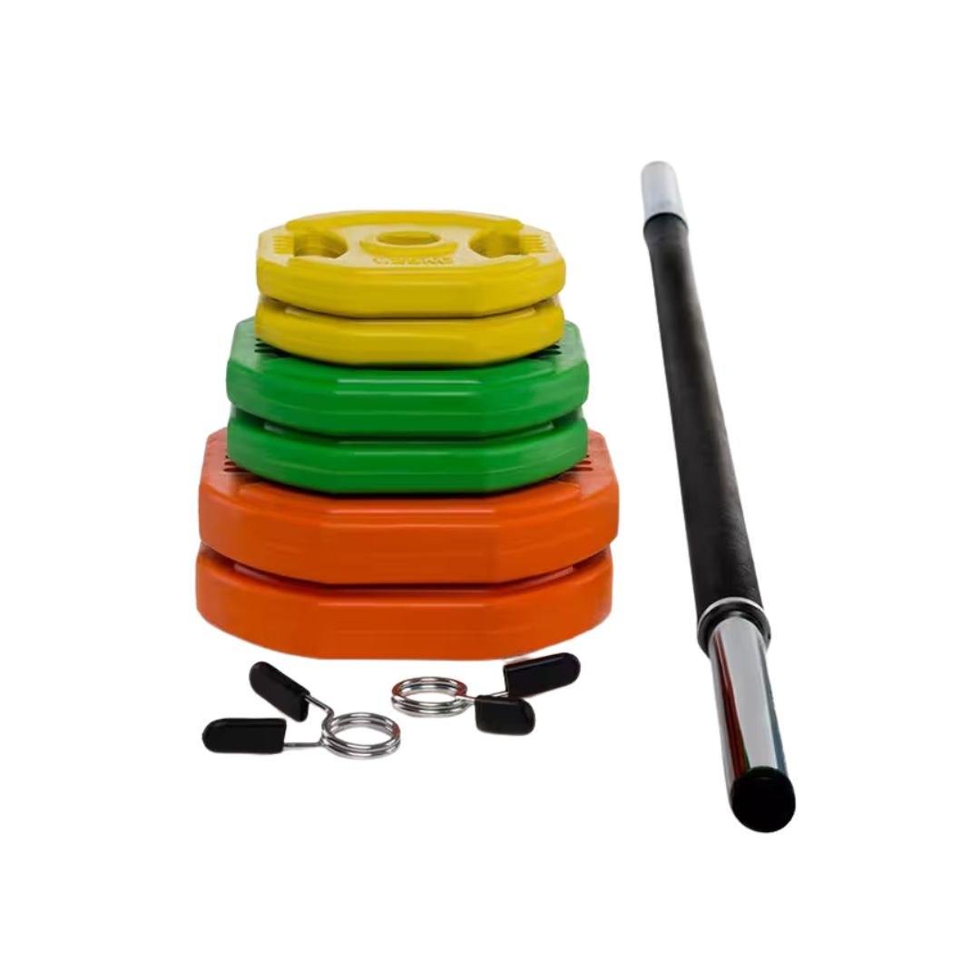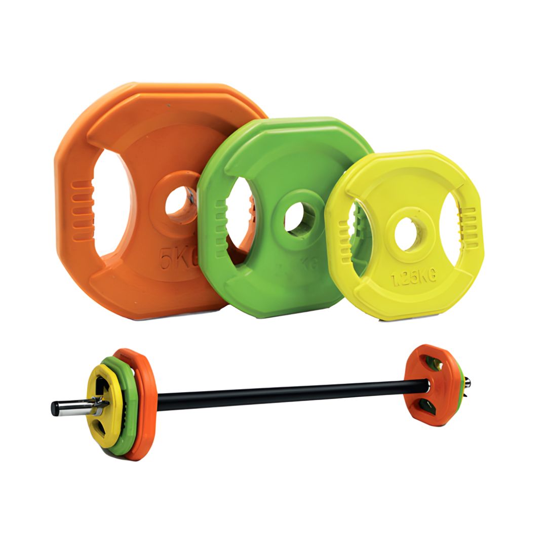 Il comprend une barre creuse facile à manipuler, associée à des disques à poignées pour une prise en main confortable et sécurisée. Les disques sont recouverts de caoutchouc, limitant le bruit et protégeant le sol pendant l’entraînement.
